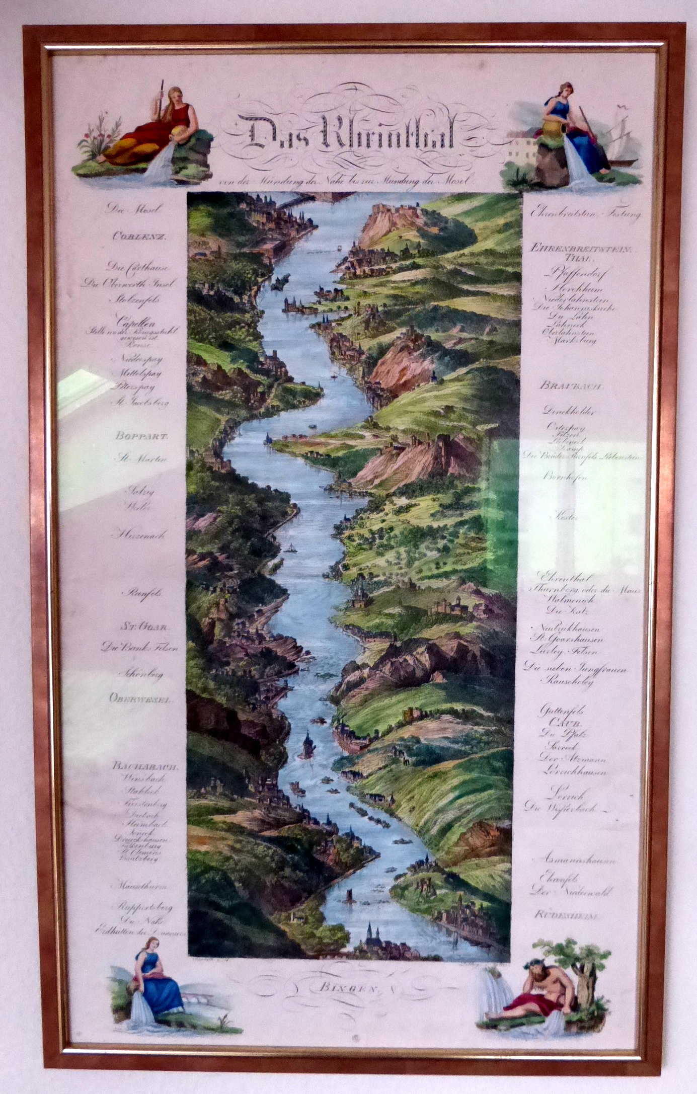 Das Rheinthal von der Mündung von der Nahe bis zur Mündung der Mosel. Lithograph shows the Rhine from Rüdesheim (below) to Coblenz (top) with Bingen centrally bottom. Two signatures: Elisabeth v. A. (bottom left) and Lithogr. V. Keller (bottom right).